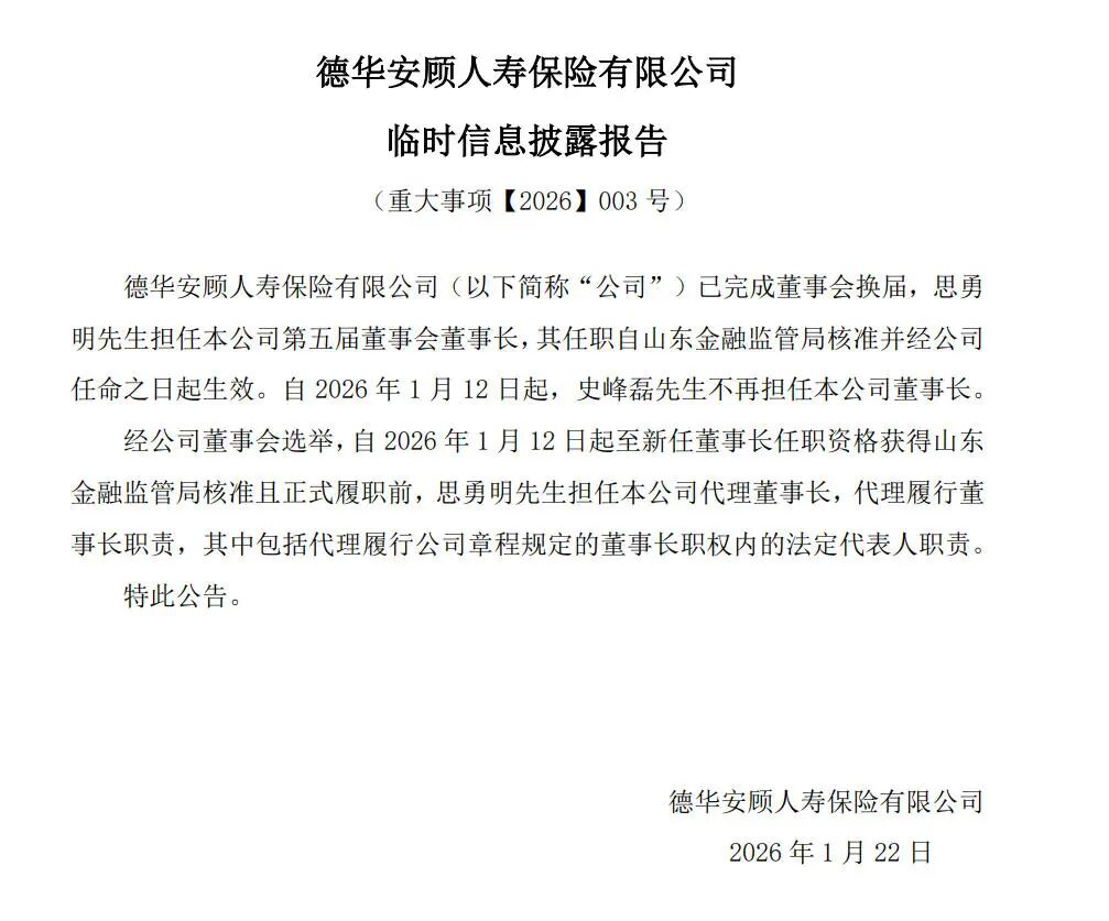 日前,德华安顾人寿公告称,公司已完成董事会换届,思勇明担任公司第五届董事会董事长,其任职自山东金融监管局核准并经公司任命之日起生效。自2026年1月12日起,史峰磊不再担任公司董事长。据悉,其将继续担任德华安顾人寿党委书记、董事。