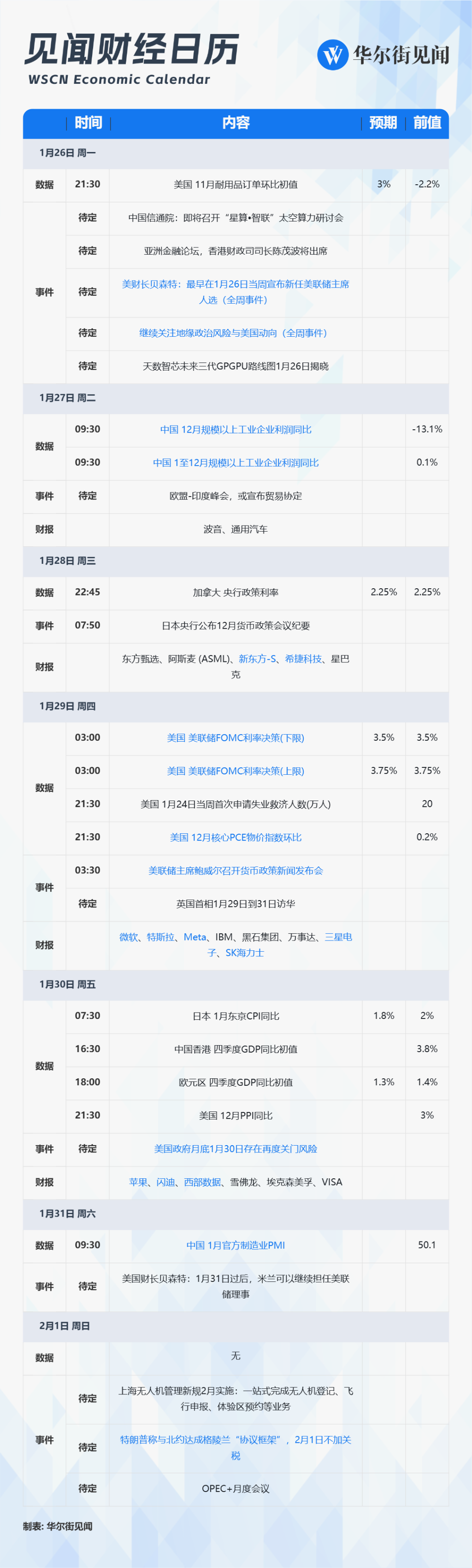 01月26日 - 02月01日当周重磅财经事件一览,以下均为北京时间: