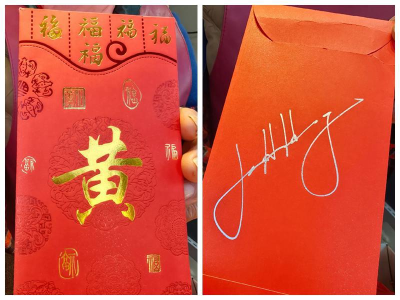 徐女士说,黄仁勋在他的店里买了栗子和糖葫芦,一共消费65元,是其同行人员用手机扫码支付的。此外,黄仁勋本人还掏出一个红包,签名之后递给她。徐女士称,她后来打开红包,发现里面有600元人民币。“今天还有人来我店里买吃的和拍照,说要沾沾喜气。”