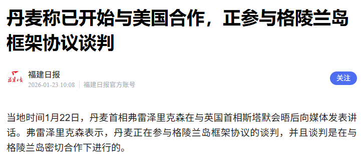 果然刚到第二天,丹麦的口风就变了,丹麦首相再次对媒体表态,称丹麦正在参与格陵兰岛框架协议的谈判。