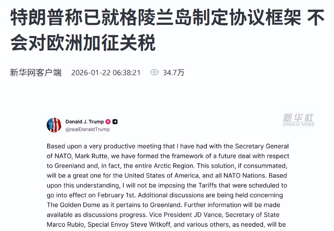 格陵兰岛事件一夜反转,特朗普宣布已经达成了框架协议。