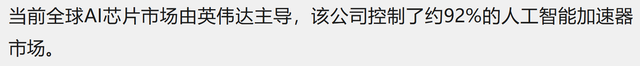 目前英伟达仍控制着全球约92%的人工智能加速器市场,中国AI芯片企业在明显技术差距面前面临着巨大的市场空间。