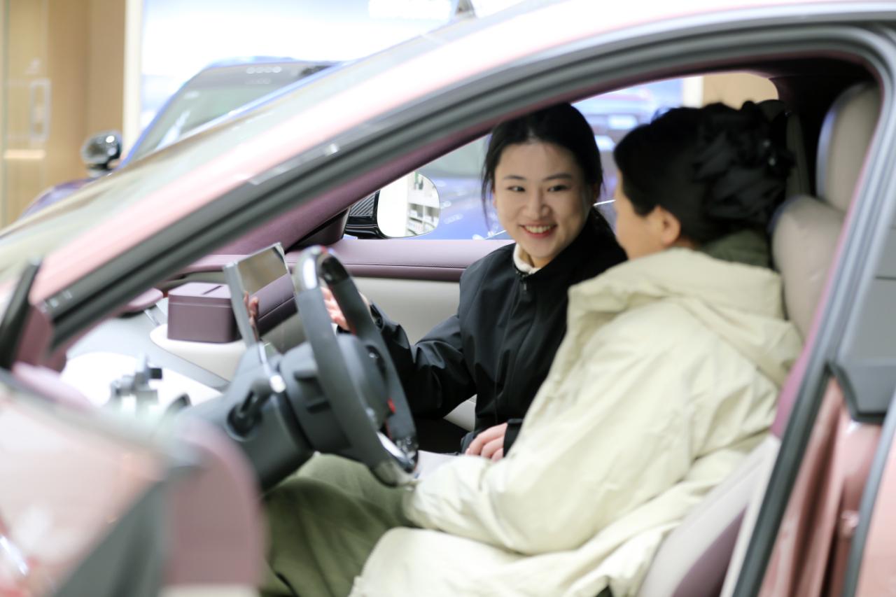 四川省乐山市一家大型商场里,消费者在了解试乘新能源汽车,咨询消费品以旧换新补贴新政策。(图片由CNSPHOTO提供)