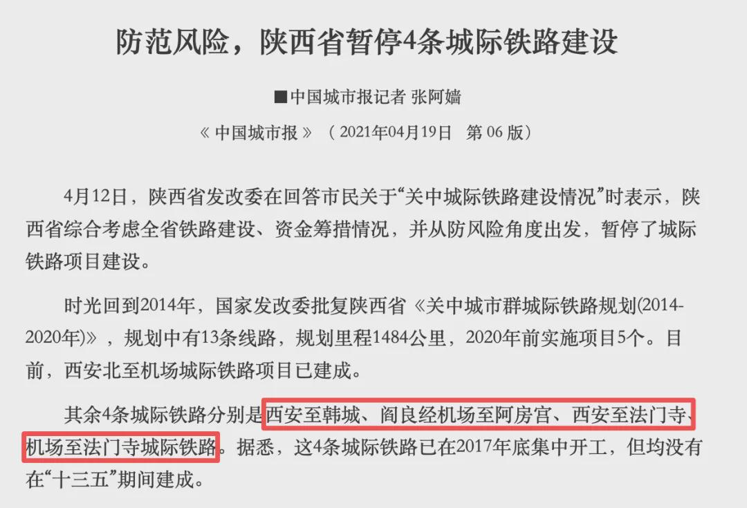 如陕西就一次性暂停4条城际铁路的建设。
