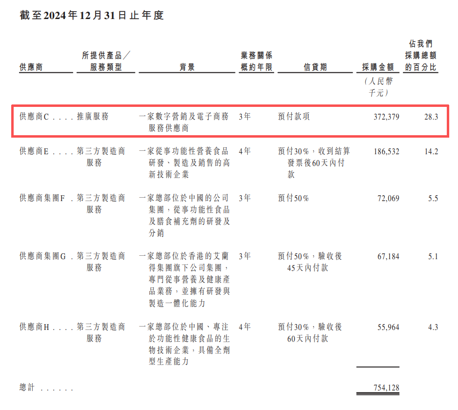 比如说2024年,公司前五大供应商中,第一大供应商“供应商C”采购的就是推广服务,当年采购额为3.72亿元,占到公司采购总额的28.3%。