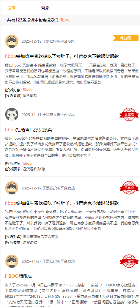 在黑猫投诉上搜索西子健康的四大品牌遭到不同规模投诉,fiboo、FoYes的投诉量都超过百条,指向产品异物、发霉变质等食品安全问题。