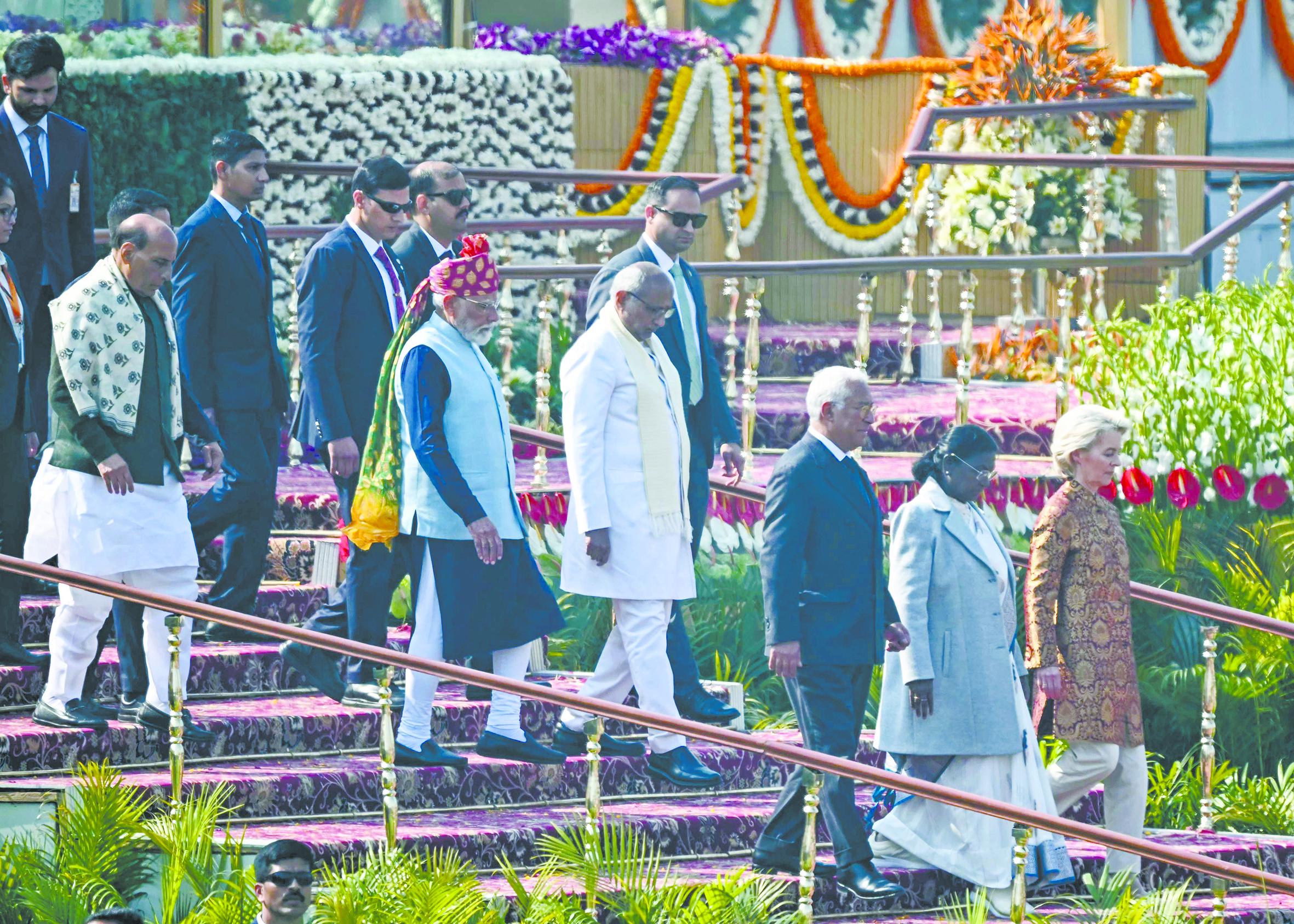 据法新社报道,科斯塔与冯德莱恩26日作为贵宾出席印度“共和国日”庆祝活动。当天,军乐队、骆驼兵等在新德里列队行进,战斗机在上空盘旋,印度还展示了导弹、无人机等装备。印度新德里电视台称,冯德莱恩26日在社交平台X上写道:“成功的印度令世界更加稳定、繁荣与安全。我们都能从中受益。”