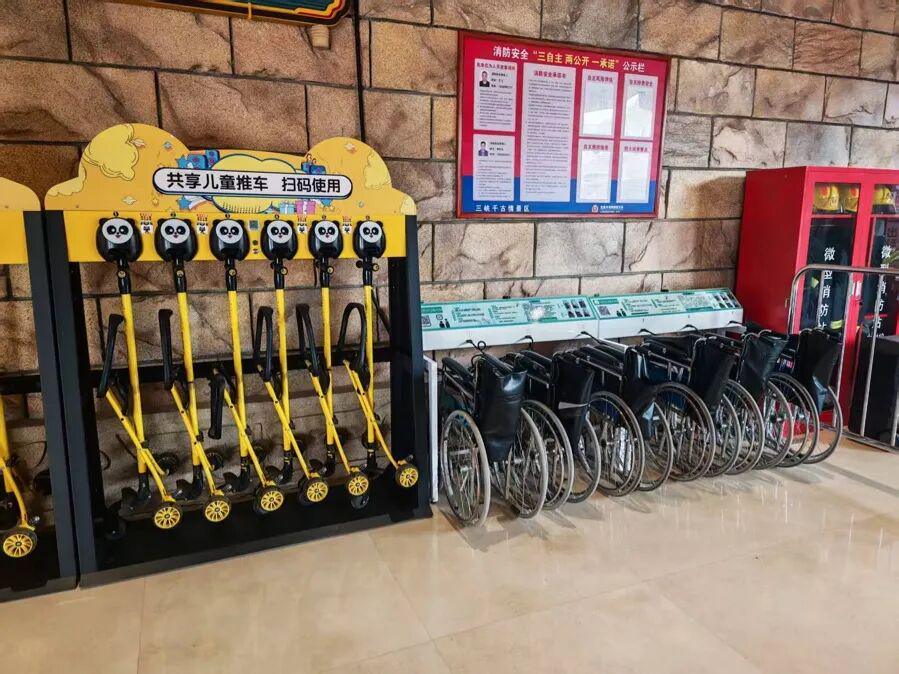 记者体验某险企最新开发的旅居康养项目,景区摆放轮椅供老年人使用(记者曹媛/摄)