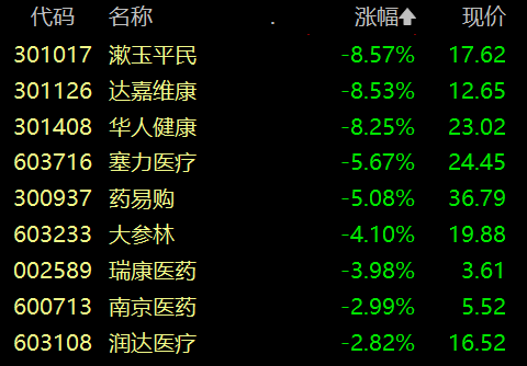 医药商业板块调整,漱玉平民、达嘉维康、华人健康跌超8%,塞力医疗跌超5%。