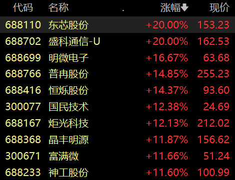 具体来看,半导体板块走高,东芯股份、盛科通信-U、康强电子、华天科技等多股涨停。