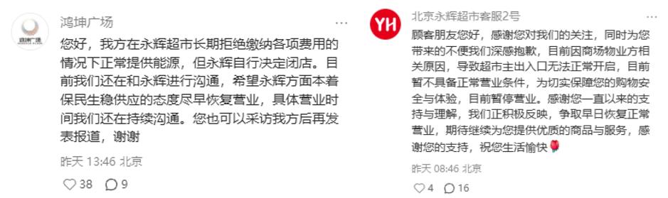 红星资本局注意到,永辉超市和鸿坤广场的相关账号活跃在社交平台的评论区中,对网友、媒体的帖子进行回复,且各执一词,均把闭店的原因归咎于对方。