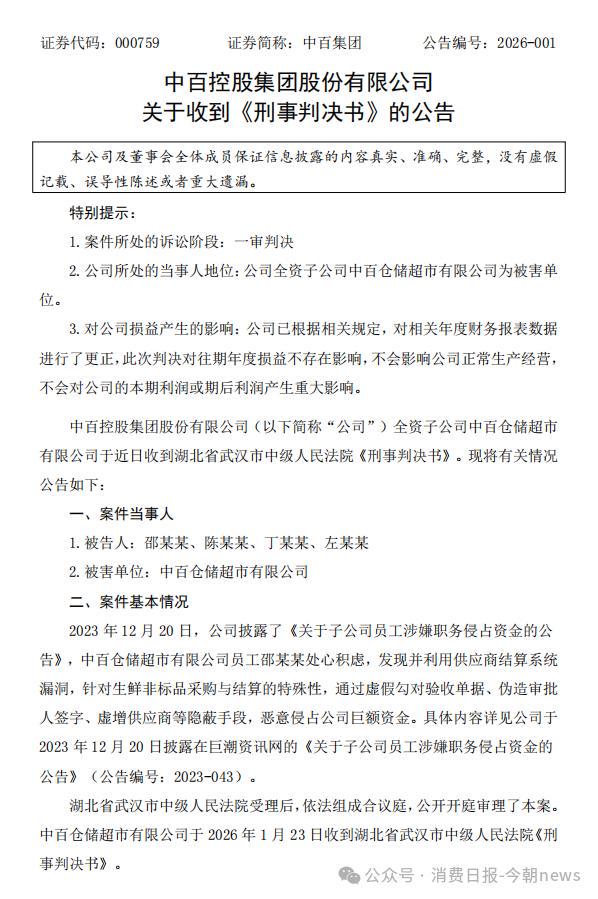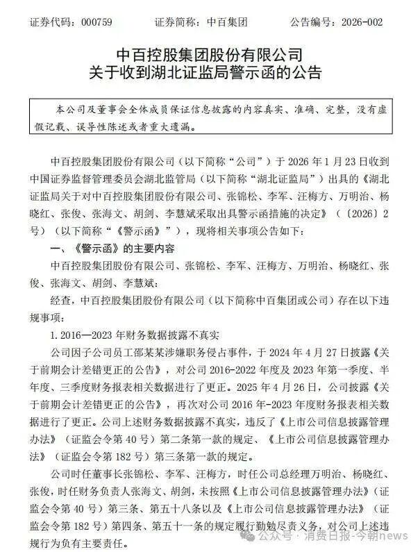 2026年1月23日晚间,湖北区域零售龙头中百集团(SZ000759,股价7.66元,市值51亿元)密集披露两则公告,一则是全资子公司中百仓储超市有限公司(下称“中百仓储”)收到职务侵占案一审判决书,另一则是公司及多名时任高管因信息披露违规被湖北证监局出具警示函。