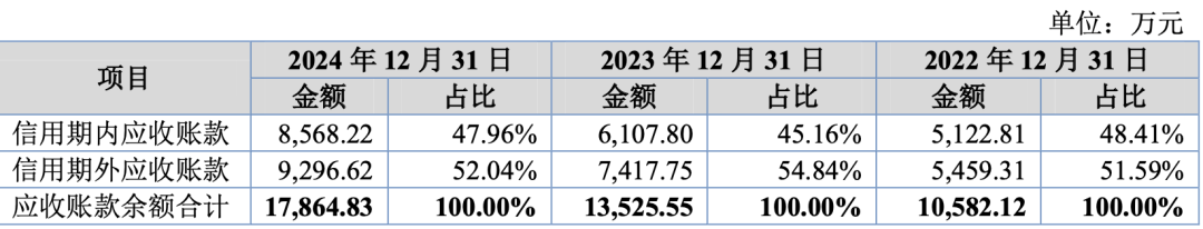 2022年至2024年(下称“报告期”)各期末,公司应收账款余额分别为10582.12万元、13525.55万元和17864.83万元,占当期营业收入的比例分别为74.23%、80.32%和76.19%,应收账款规模较大。