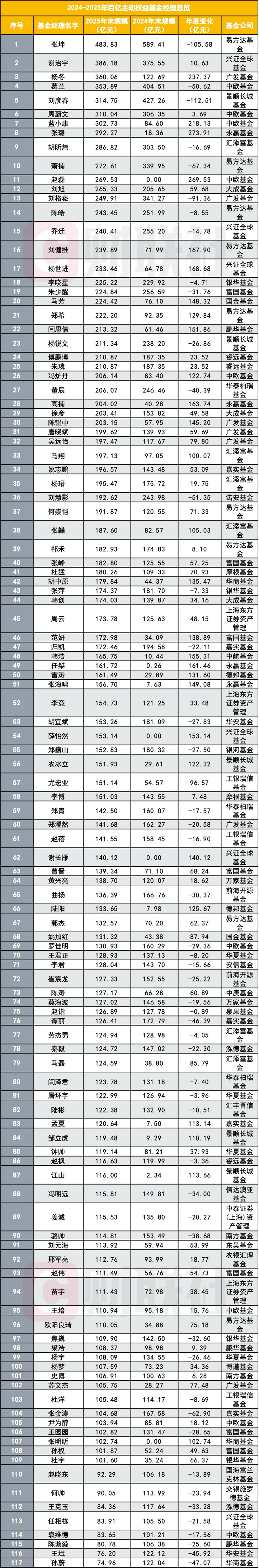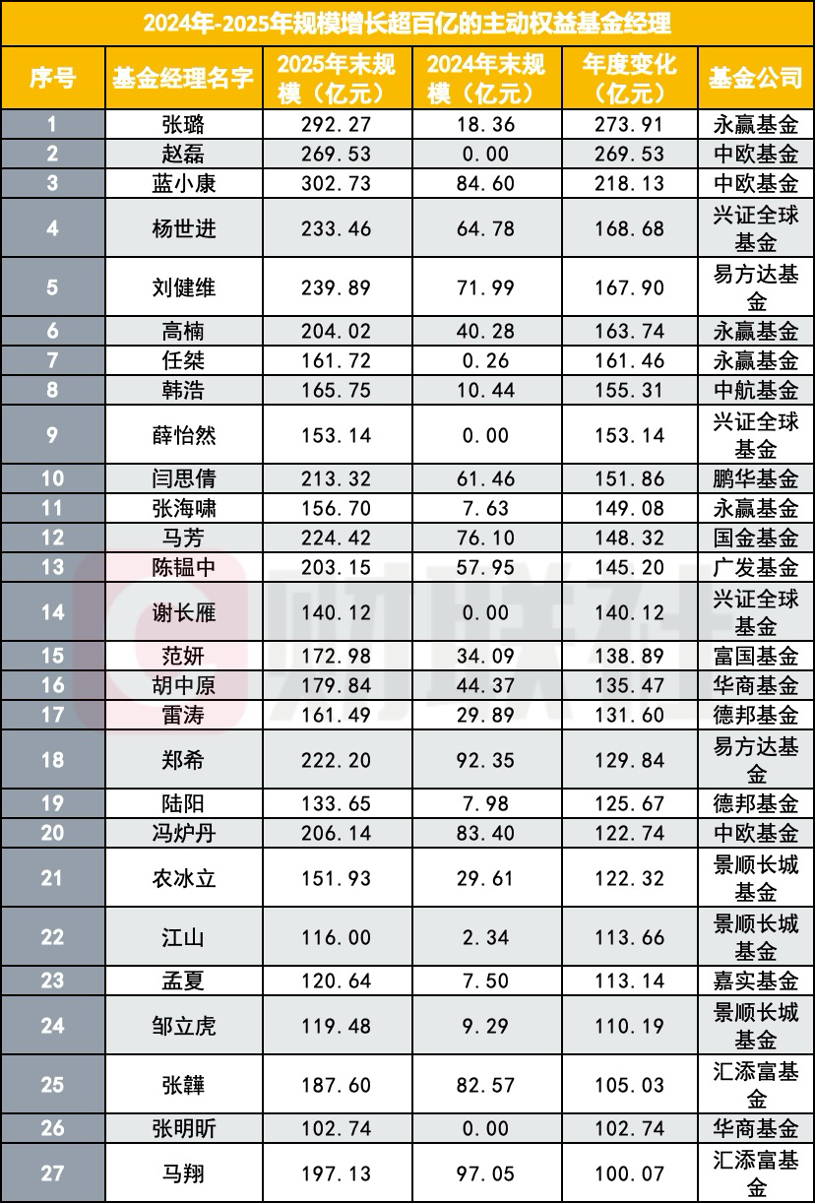 百亿主动权益基金经理总数从2024年末的71位增至2025年末的109位,而且行业头部阵营明显扩大。
