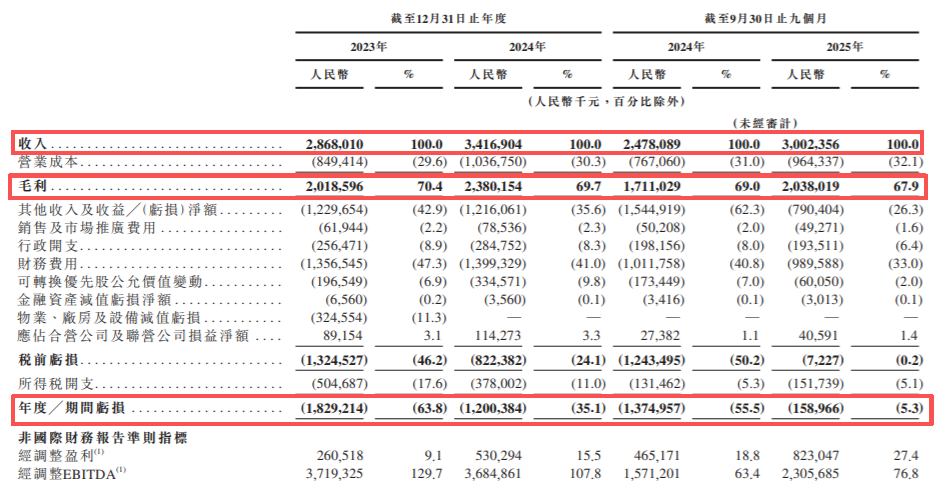 2023年、 2024年和2025年前9个月,分别亏损18.29亿、12.00亿和1.59亿。