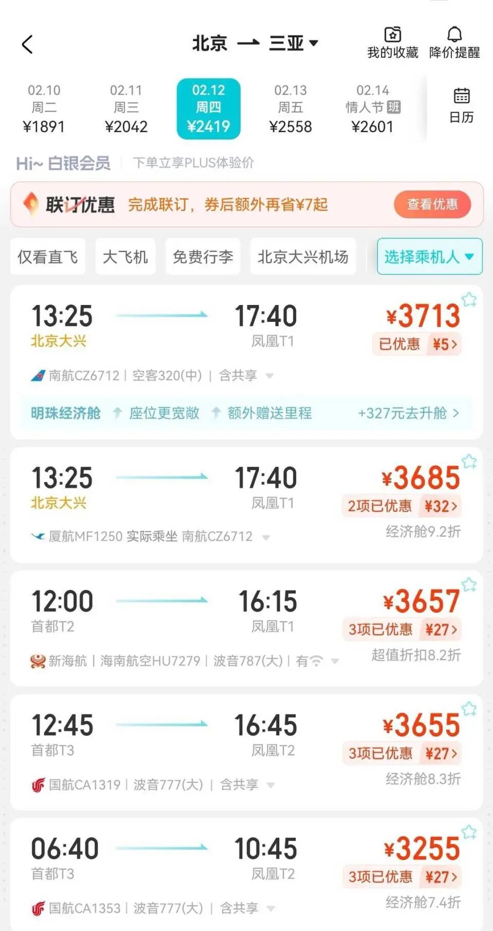 业内人士表示,此轮票价上涨并非个别日期现象,而是从节前一周开始逐步抬升。春节假期属于全年航空出行高峰期,三亚作为传统避寒旅游目的地,出行需求集中释放,在运力相对有限的情况下,票价上涨属于正常市场波动。建议旅客尽量提前规划行程,或关注中转航班及非热门时段出行,以降低成本。