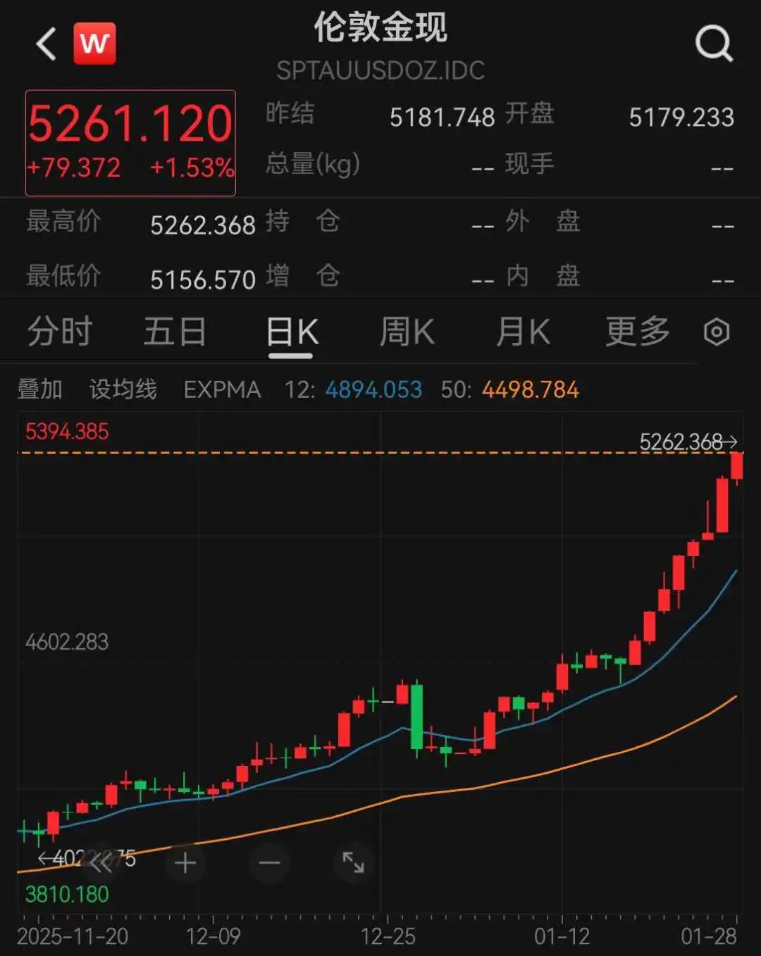 1月28日午后, 现货黄金延续强劲涨势,现突破5260美元/盎司,日内涨近80美元。