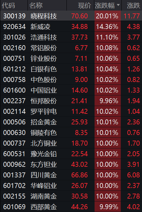 A股有色金属板块集体大涨,截至发稿,晓程科技20%涨停,白银有色、中国铝业、招金黄金、北方铜业、四川黄金等近20股涨停。