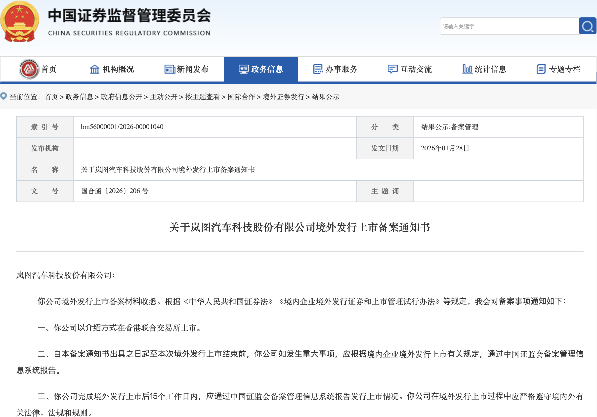 新京报贝壳财经讯(记者王琳琳)1月28日,中国证监会发布《关于岚图汽车科技股份有限公司境外发行上市备案通知书》。备案通知书显示,岚图汽车以介绍方式在香港联合交易所上市。