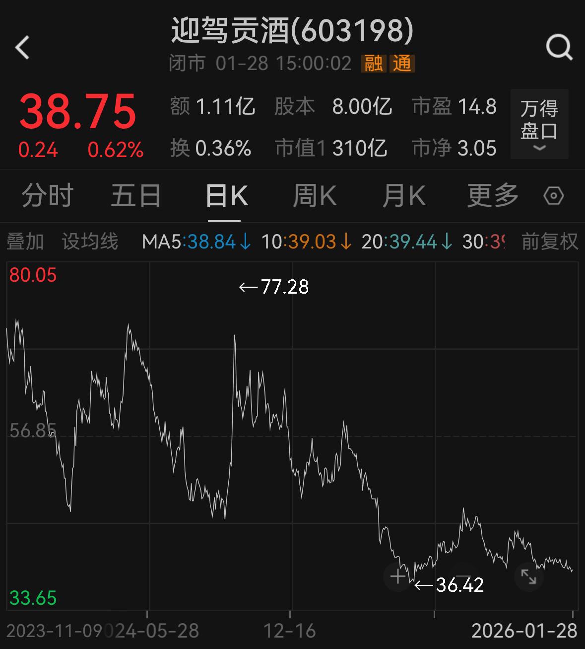 资本市场上,1月28日,迎驾贡酒股价尽管上涨0.62%,报收38.76元/股(前复权,下同),但跟90天内机构目标均价49.11元/股相比,差距明显,较历史高点更是已经腰斩;截至27日,近三个月融资净流出超5500万元。尽管仍有机构维持“买入”评级,但长期而言,合规风险已成为制约估值提升的重要因素。