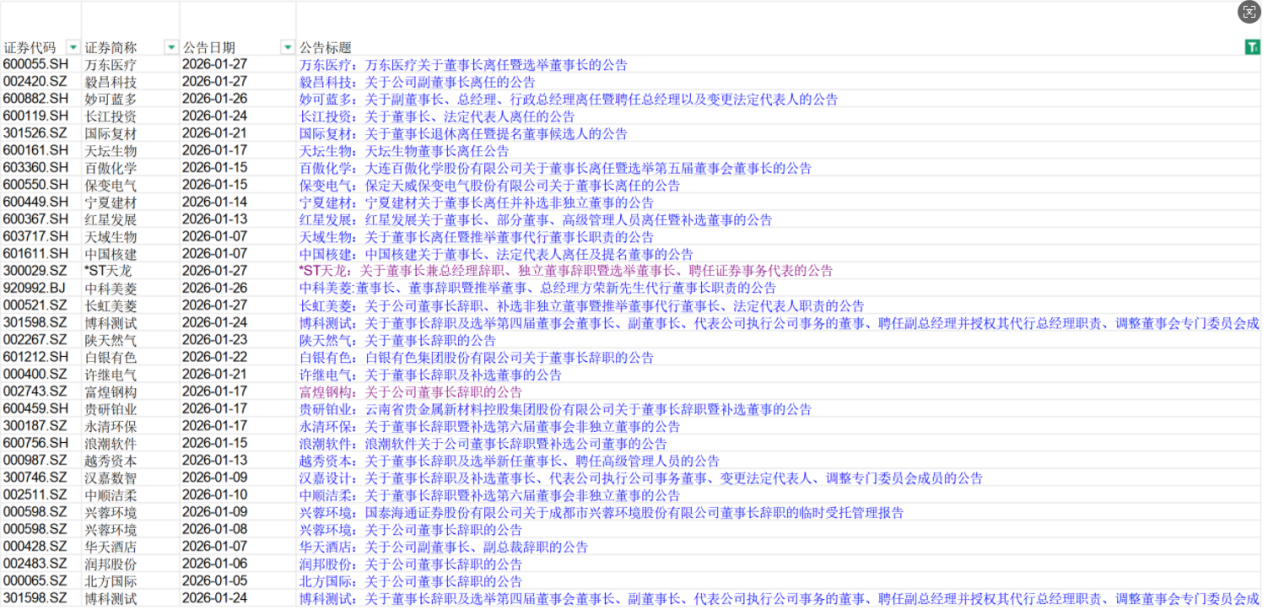 除了天域生物,富煌钢构实控人、董事长杨俊斌2025年9月公司因收购中科视界信息披露违规被证监会立案,11月安徽监管局对杨俊斌处以380万元罚款,公司及关联方合计被罚3180万元,今年1月17日公告离任,离任后不再担任公司任何职务;2025年白银有色因未披露30亿元理财产品被处罚,王普公作为时任董事长被罚款150万元。1月21日,白银有色公告董事长王普公因工作变动辞职,辞去董事长、董事及董事会专门委员会相关职务,辞职后不再担任公司任何职务。