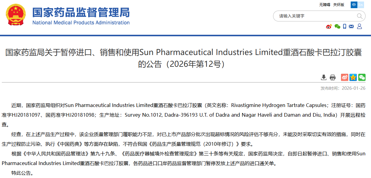 红星资本局1月28日消息,1月26日,国家药监局发布了关于暂停进口、销售和使用两款药物的消息,这两款药物均为印度厂家所生产,分别是Sun Pharmaceutical Industries Limited(印度太阳制药工业有限公司,简称“太阳制药”)的重酒石酸卡巴拉汀胶囊以及Supriya Lifescience Ltd.的马来酸氯苯那敏原料药。