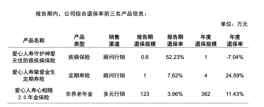 报告显示,爱心人寿2025年第四季度综合退保率前三名产品中,爱心人寿守护神爱无忧防癌疾病保险(顾问行销渠道)报告期退保率达52.23%。