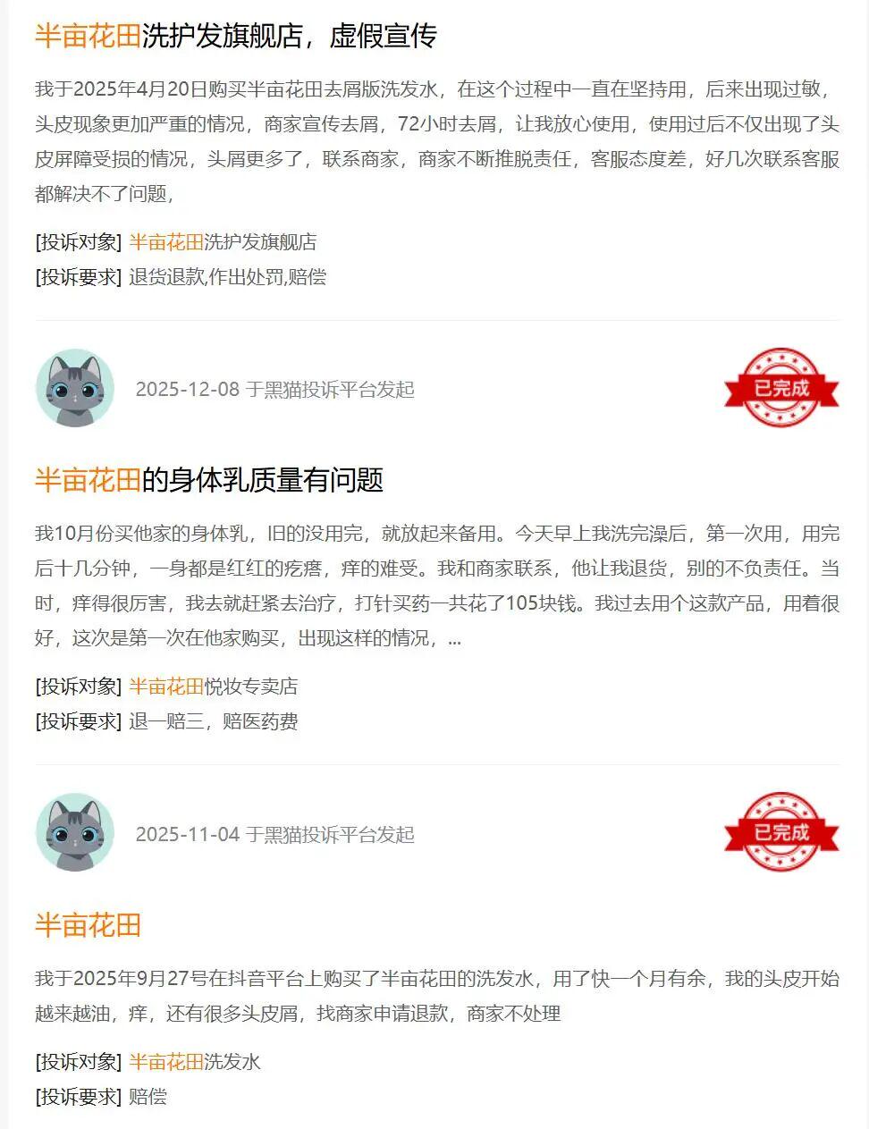 截至发稿,黑猫投诉平台已有280 条涉及 “半亩花田” 的投诉,主要反映洗发水、洗面奶、身体乳等产品使用后出现过敏、刺激、症状加重等不良反应。