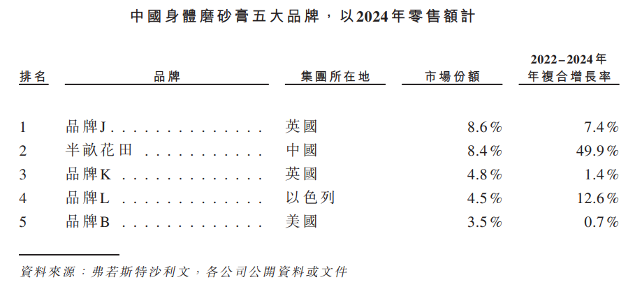 中国身体磨砂膏第二名;