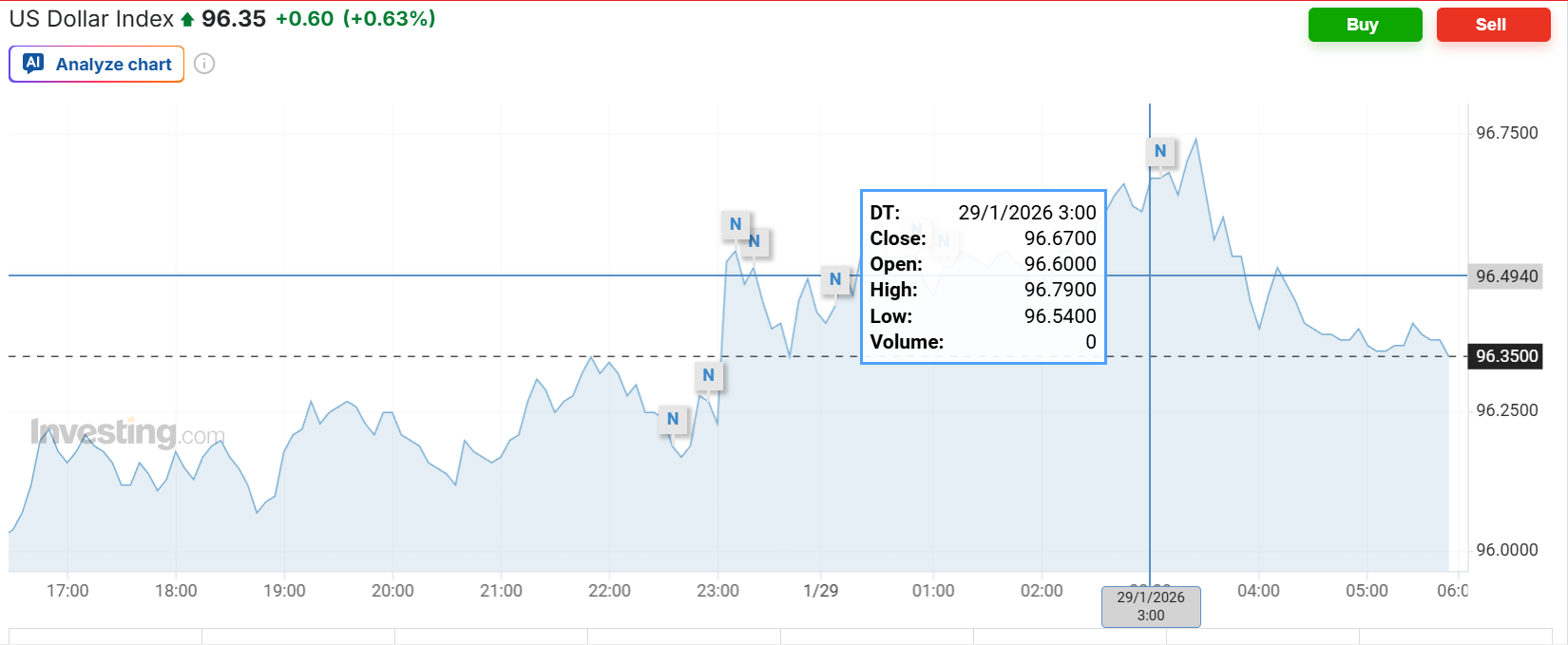 北京时间凌晨3点,美联储1月会议如期按兵不动,声明中对劳动力市场的措辞比上个月更乐观,同时提到通胀仍然偏高,暗示不急行动,美联储主席人选沃勒支持再降息25个基点,美股和美债短线波动不大,美元短线走高: