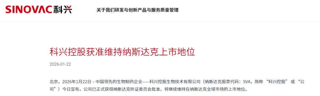 1月22日,科兴控股生物技术有限公司(下称科兴生物,SVA.O)在官网发布消息,称公司正式获得纳斯达克听证委员会批准,将继续维持上市地位。