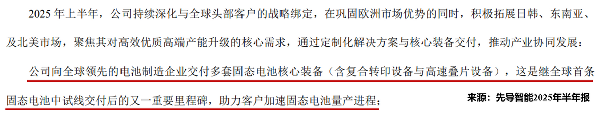 2025年上半年,公司又向全球领先的电池制造企业交付多套固态电池核心装备(含复合转印设备与高速叠片设备),这是继全球首条固态电池中试线交付后的又一重要里程碑。