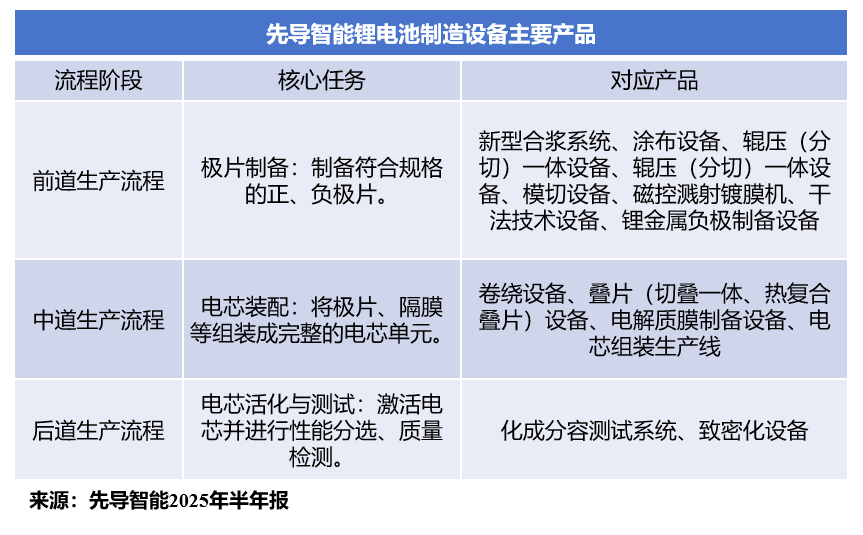而先导智能的锂电池制造设备完整覆盖了锂电池制造前、中、后三道环节,产品主要包括涂布设备、卷绕设备、叠片(切叠一体、热复合叠片)设备、电芯组装生产线等。