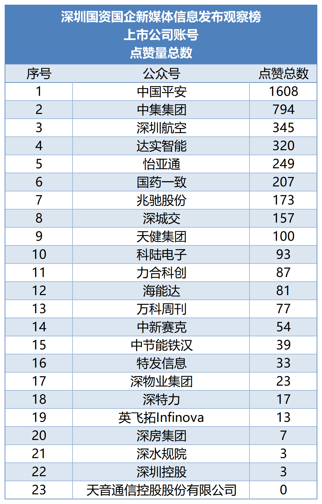 点赞量方面,中国平安、中集集团、深圳航空分别以1608、794、345的点赞量位列前三,与阅读量相对应,呈现明显的数据梯度。天音通信控股股份有限公司点赞量为0,深水规院、深圳控股均仅收获3个点赞,处于点赞量榜单尾部。