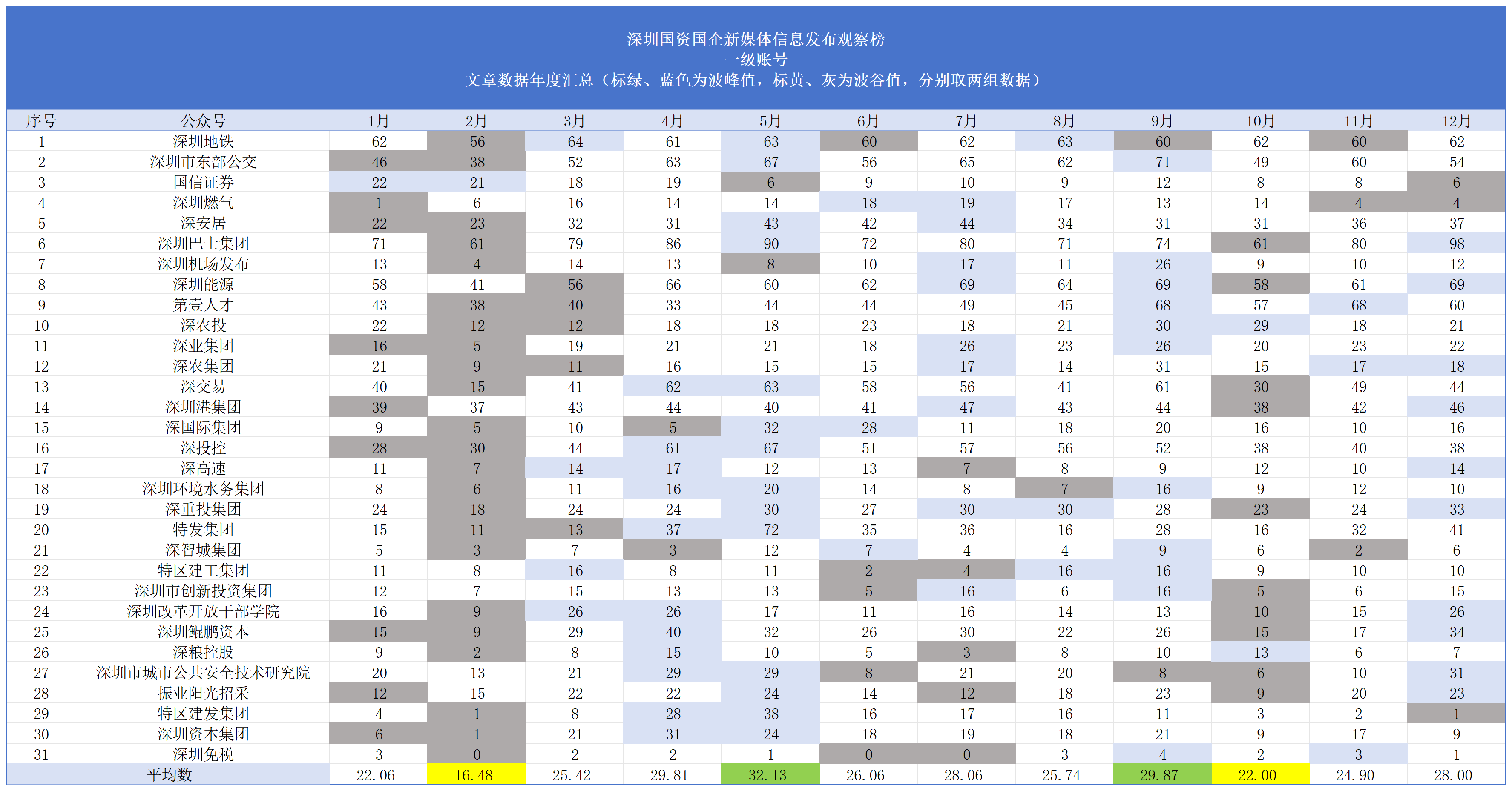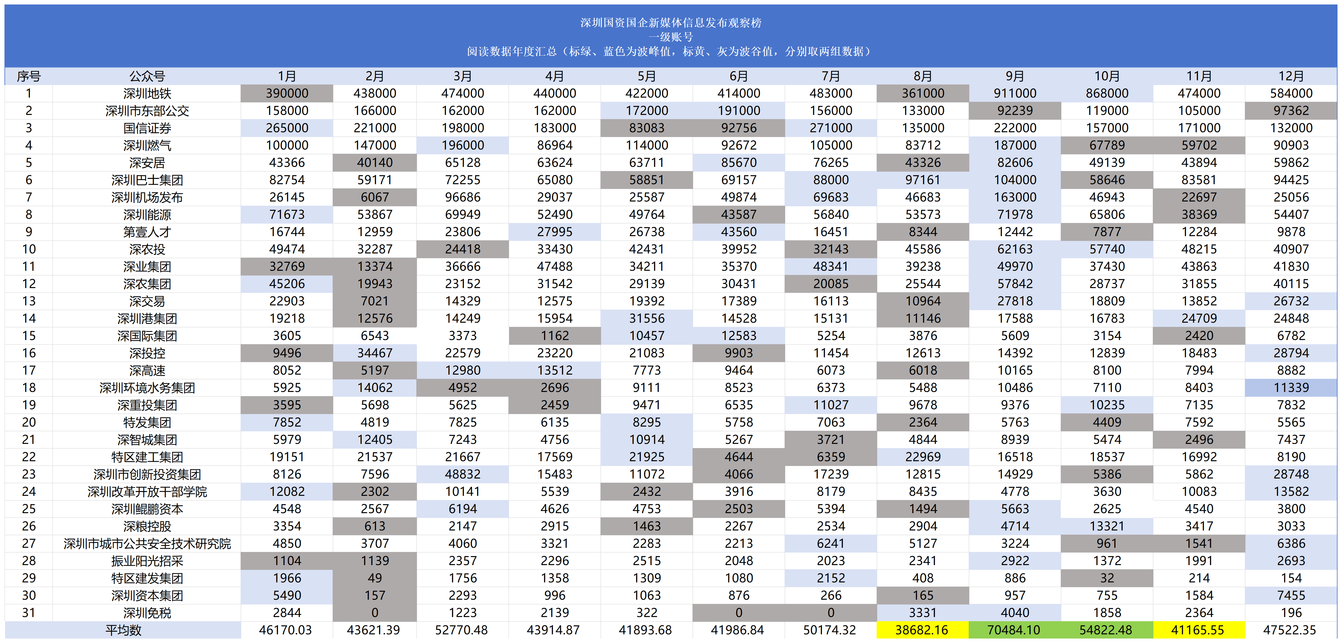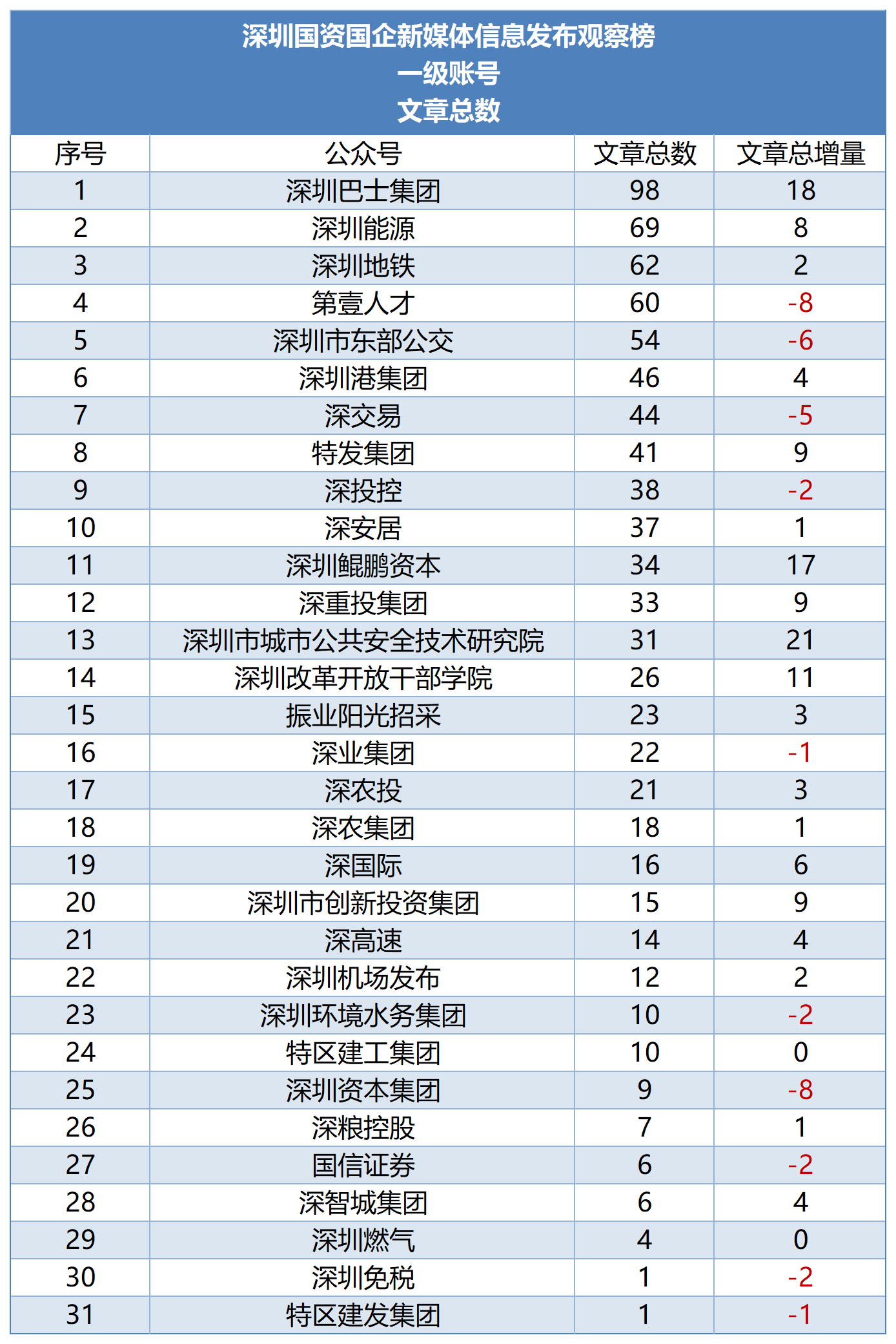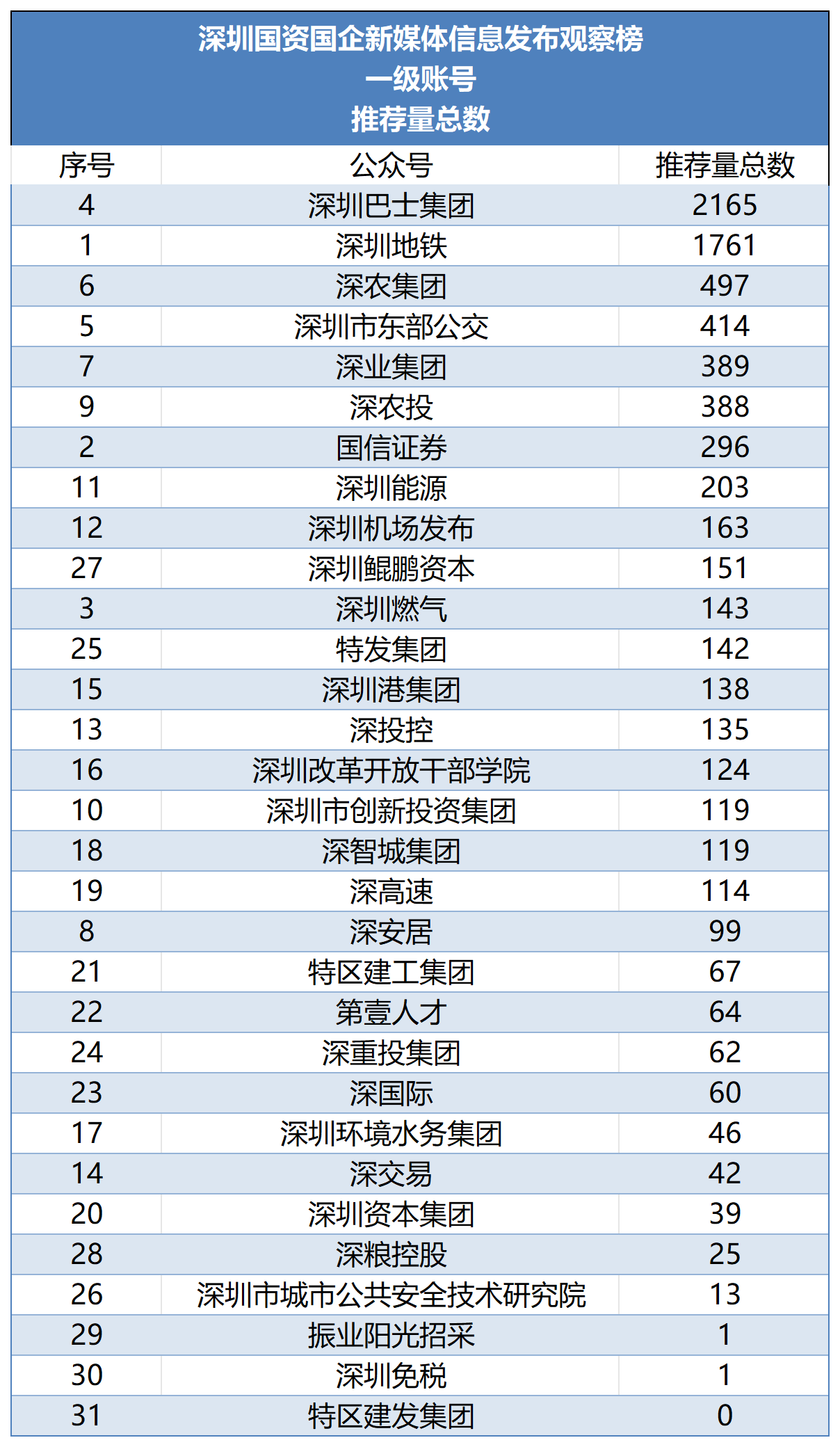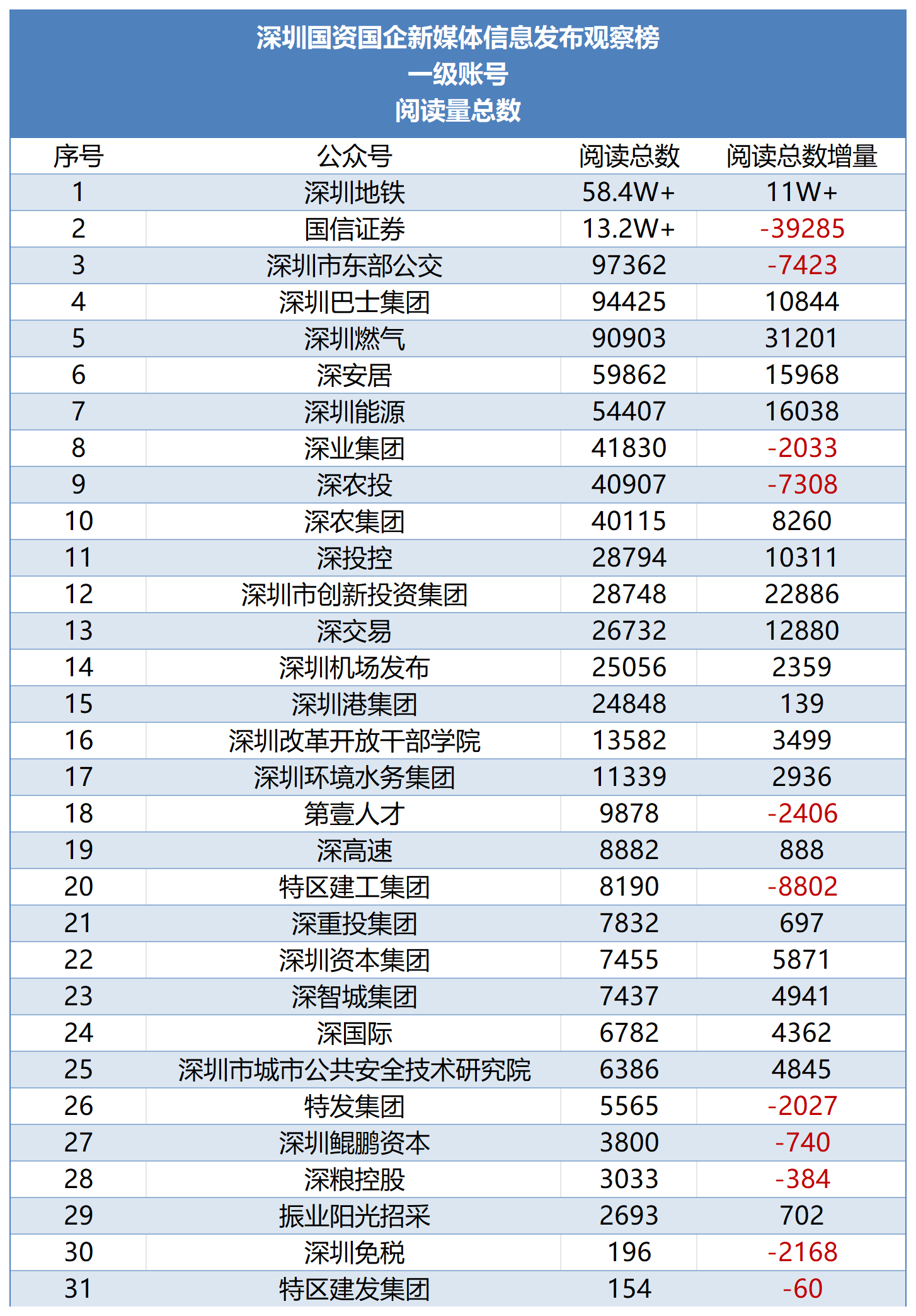 从2022年第一季度起,南都·湾财社对深圳市属国有企业及深圳国资控股或参股的上市公司新媒体的信息发布情况进行测评,以阅读量为主要参考指标观察账号影响力,推出“深圳国资国企新媒体信息发布观察榜”。对深圳国资国企新媒体优秀传播案例进行提炼和分析,总结运营和传播经验,致力于促进深圳国资国企新媒体的蓬勃发展。 本月推出的是“2025年12月深圳国资国企新媒体信息发布观察榜”(简称“深圳国资新媒体信息观察榜”)。测评对象一共有31个深圳国企一级账号,以及23个深圳国资控股或参股的上市公司微信公众号,合计54个账号。其中,31个深圳国企一级账号中,多家公司已上市。