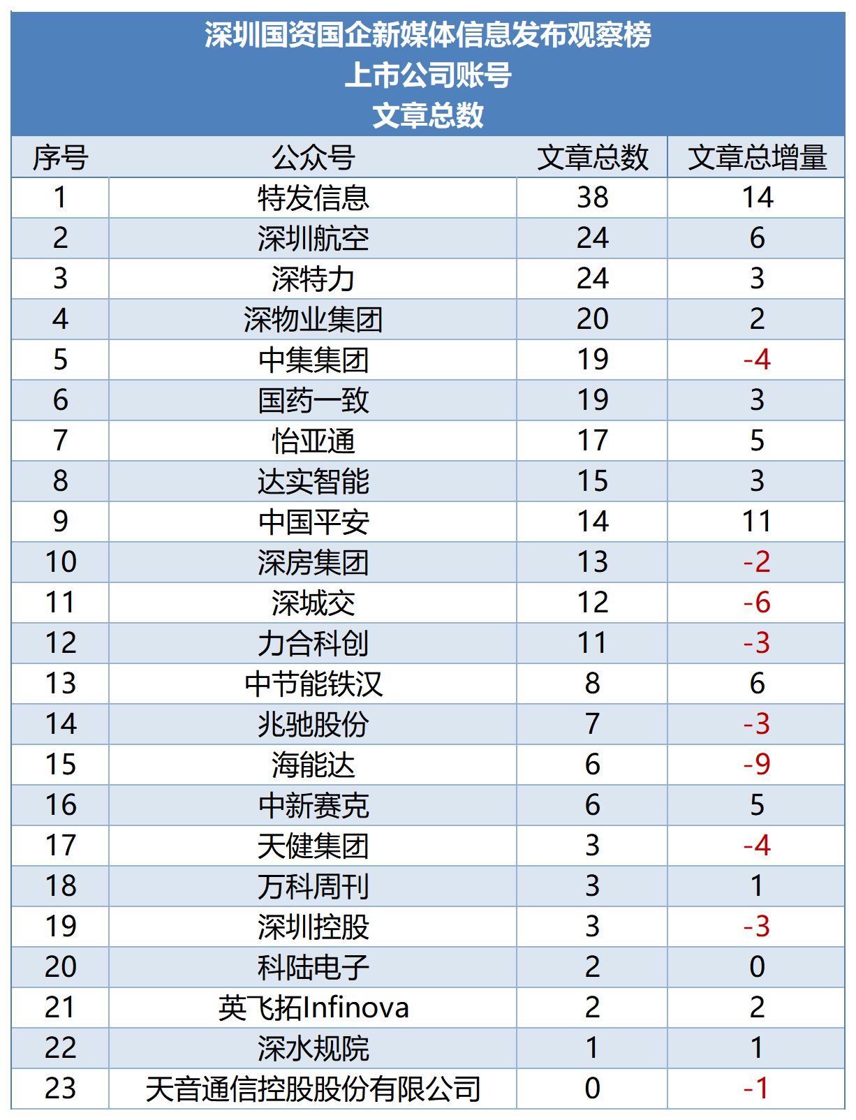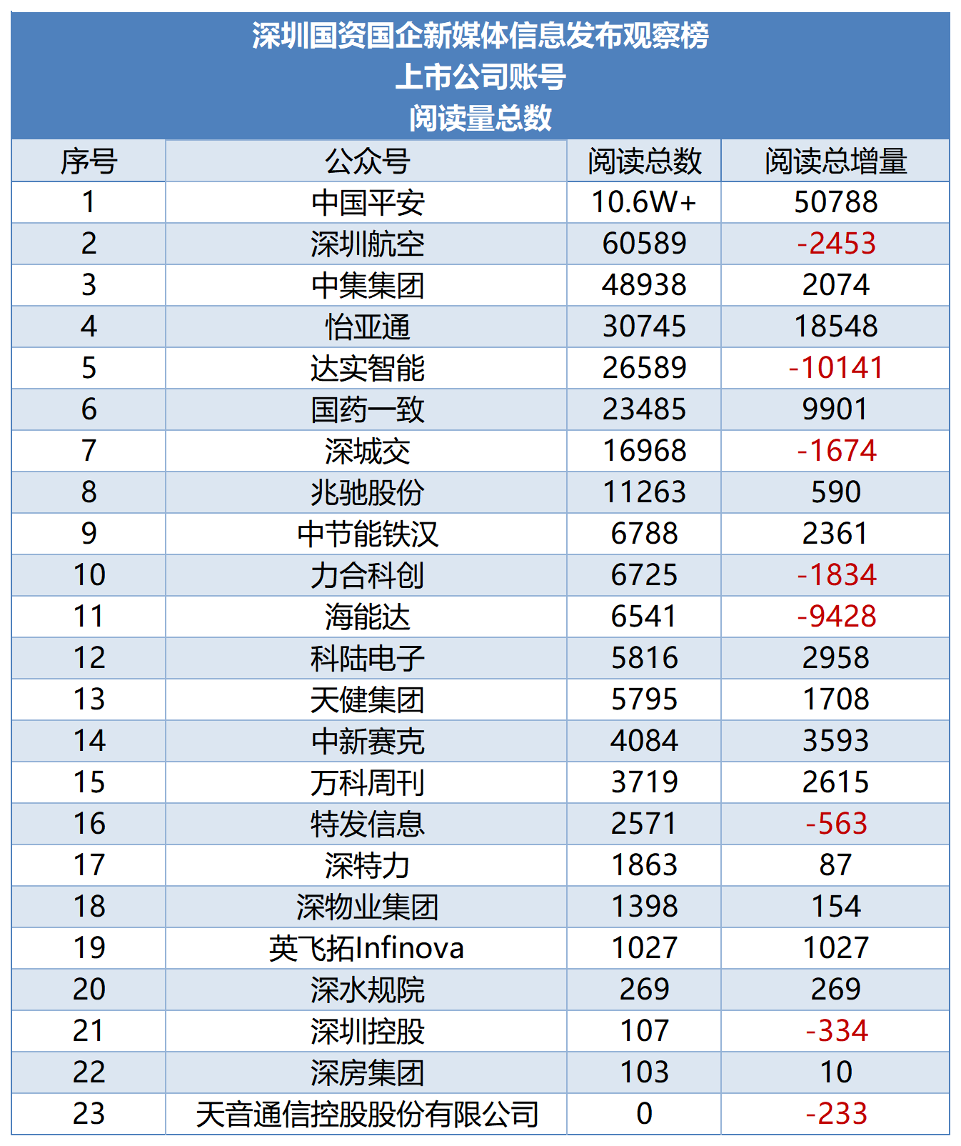 从阅读总量来看,部分账号阅读量回升,实现大幅增长。深圳地铁阅读量新增11W+,以58.4W+的成绩居榜首;深圳市创新投资集团阅读量增长22886,涨幅较为突出。但也有账号阅读量出现下滑,其中国信证券减少39285,特区建工集团减少8802,跌幅相对明显。