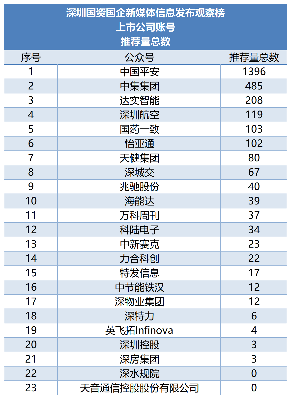 推荐量方面,头部账号内容分享意愿较强,传播辐射范围更广。中国平安、中集集团、达实智能分别以1396、485、208的推荐量排名前三。而尾部账号因发稿数量有限,推荐量个位数居多甚至O推荐,天音通信控股股份有限公司、深水规院推荐量均为 0,深圳控股仅获得 3 次推荐。
