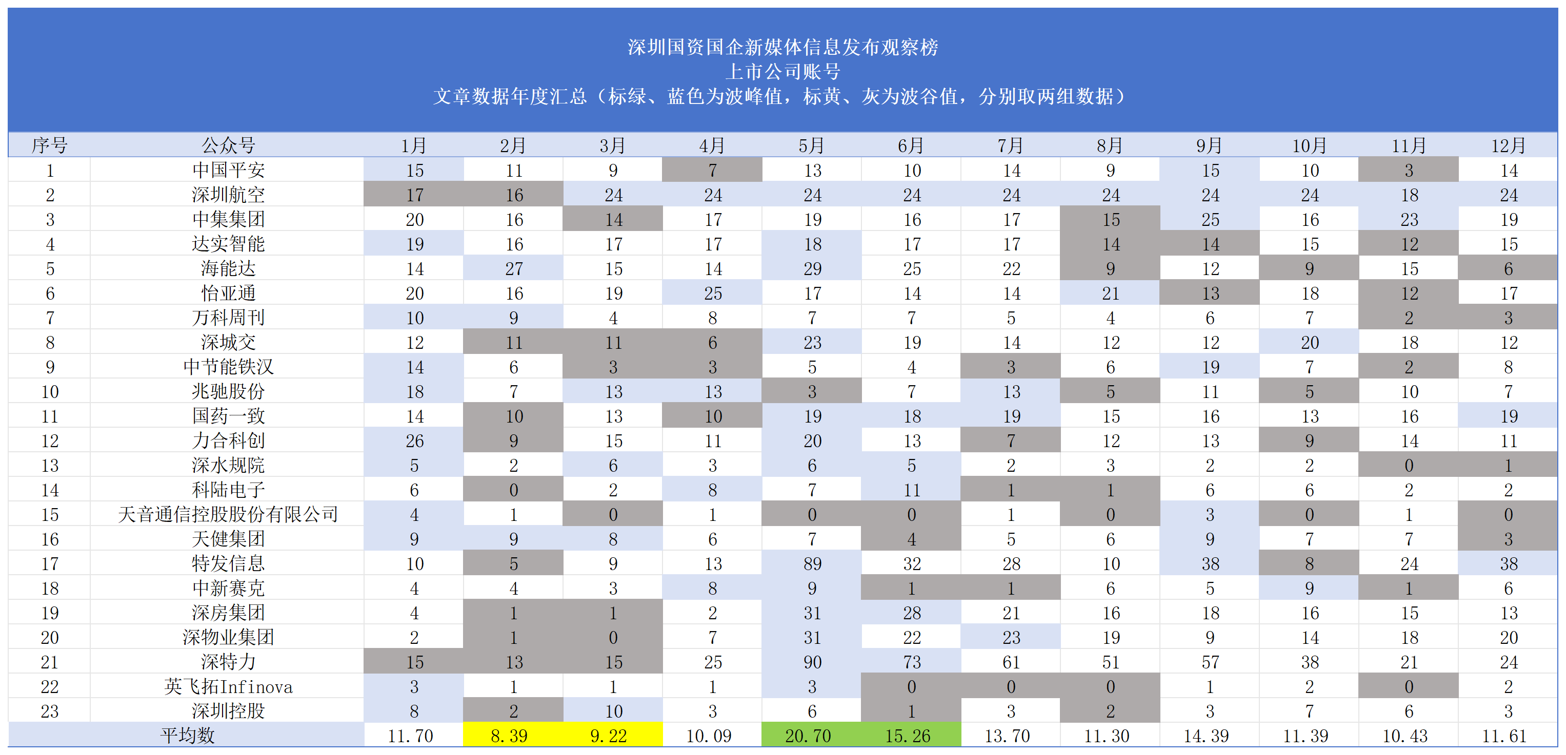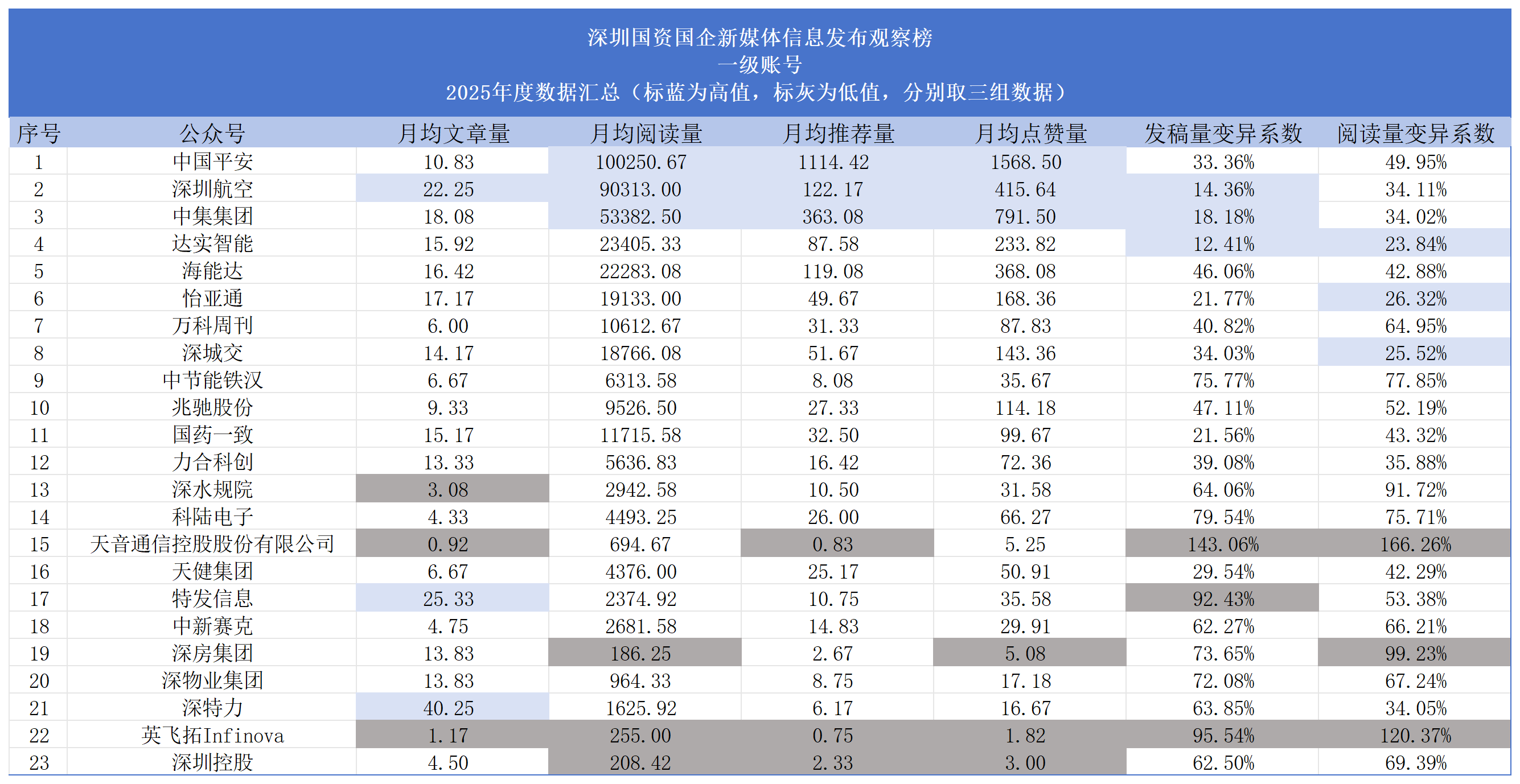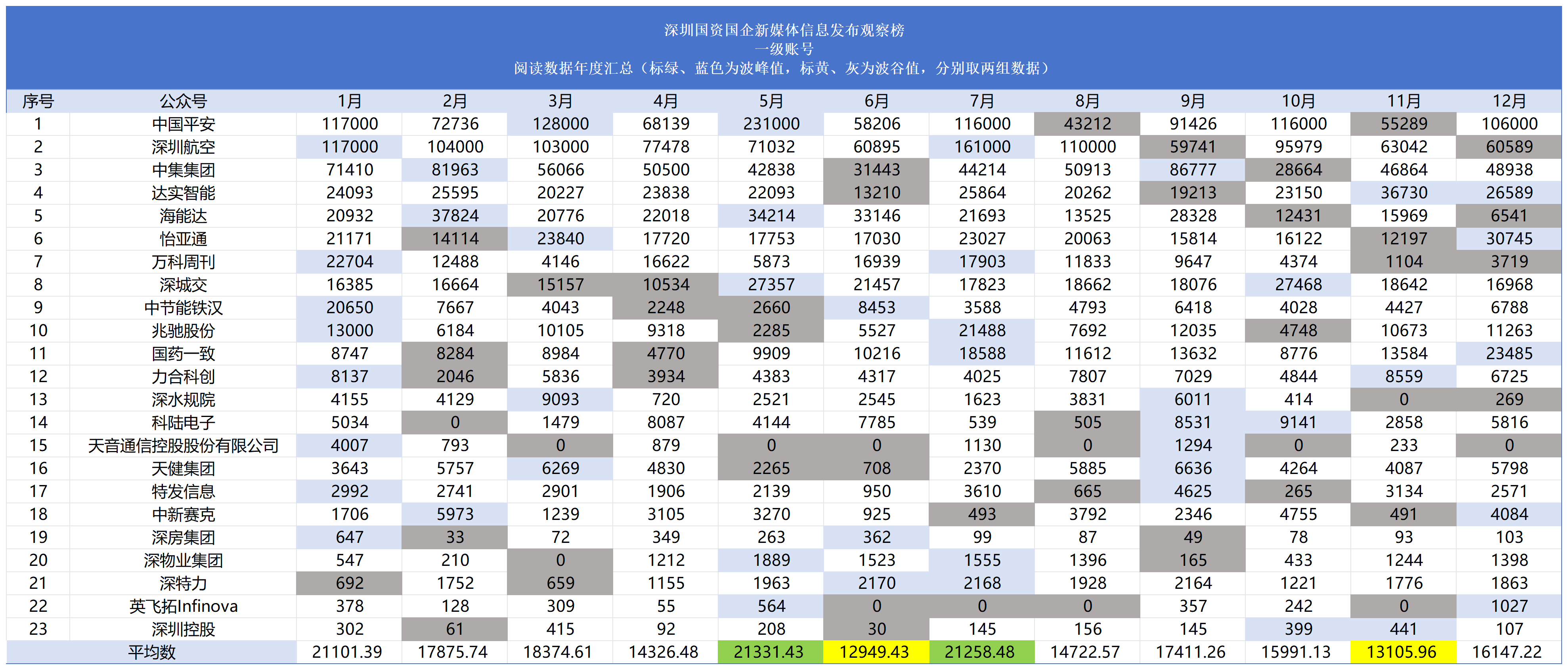上市公司账号整体阅读高峰在5月、7月,平均阅读量为21331次、2158.48次,中国平安、深圳航空发挥头部效应,拉高均值,但各账号高阅读量集中在1月份,低谷集中在11月份。部分账号如深房集团、深圳控股、英飞拓Infinova月均阅读量长期低于500次,显示出账号传播力较弱。