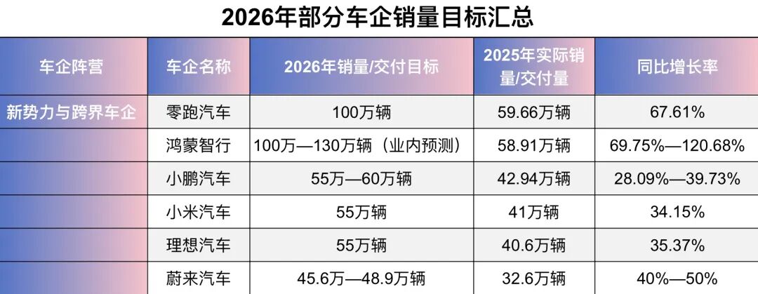 在新能源渗透率持续提升的背景下,新势力与跨界车企成为目标增速最快的阵营,多数品牌将增速锁定在30%以上,零跑汽车与鸿蒙智行更是剑指百万辆规模,展现出对市场份额的强烈渴求。