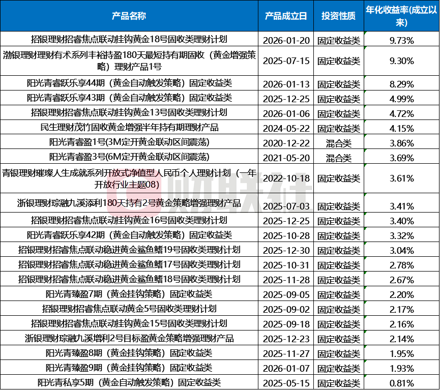 据法询理财网统计数据,截至1月30日,有数据的22只黄金主题理财产品中,均实现正收益,其中3只产品成立以来年化收益率超8%。如下图所示: