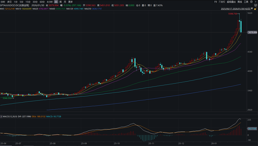 然而,在持续“急速”上涨后,市场在1月29日晚间迎来剧烈反转:现货黄金大幅跳水。1月30日,现货黄金日内跌幅扩大至10%,失守5100美元大关。