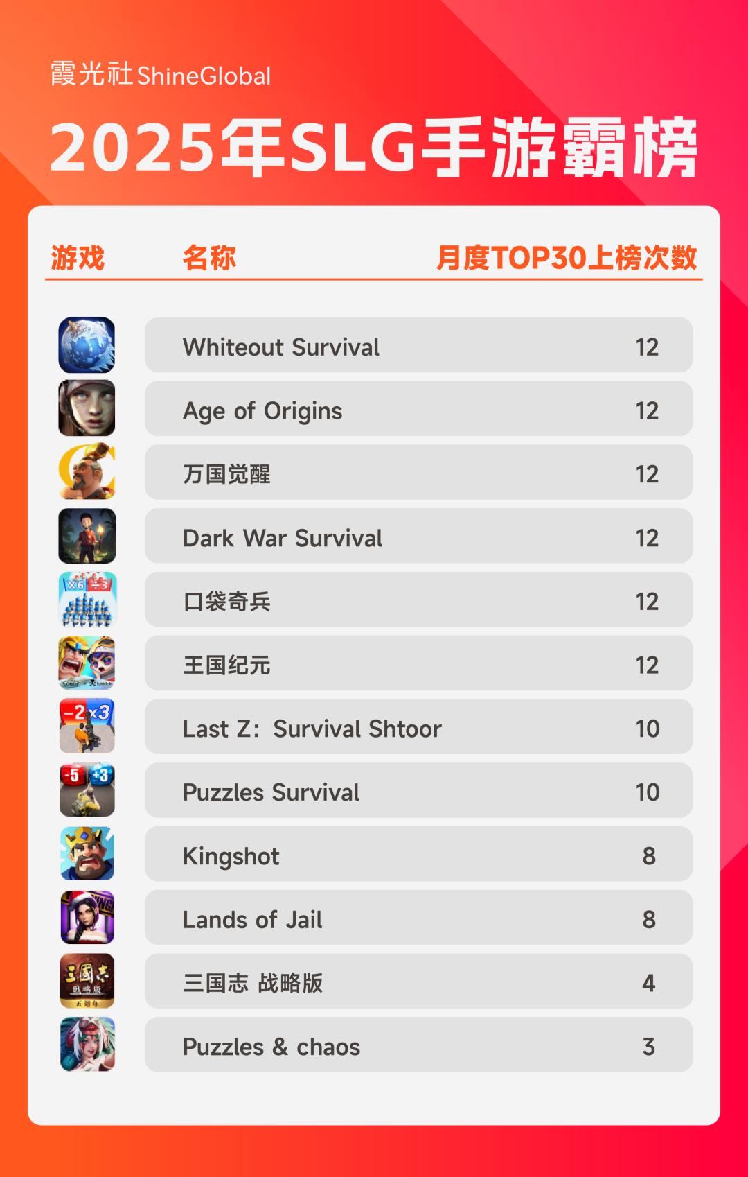 2025年月度国产手游海外收入Top 30中,SLG几乎一年时间里,都占据榜单的三分之一。数据来源:Sensor Tower