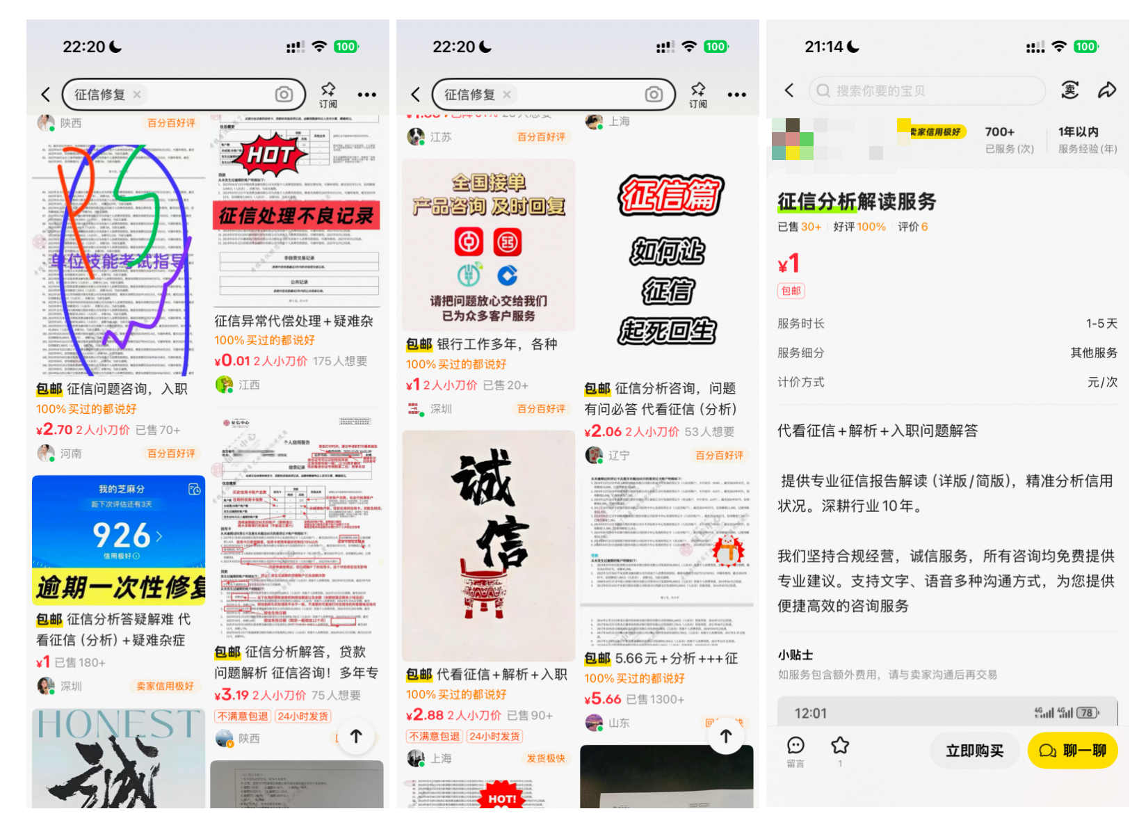 近日,时代周报记者调查发现,有不少人在闲鱼、小红书等平台以“免费帮忙看征信”“代看征信”“征信分析解读服务”等为诱饵,开展收费数千元至数万元的“征信修复”业务。