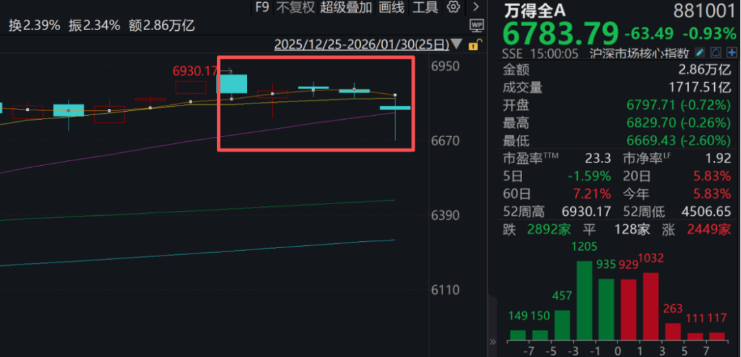 刚过去的交易周(1月26日至30日),A股整体呈现放量震荡格局,日均成交额超3万亿元。在大资金持续净流出背景下,股指在周二、周五两度出现急速跳水,幸运的是当日收盘均收复了大部分失地,画出V型反弹的K线走势。