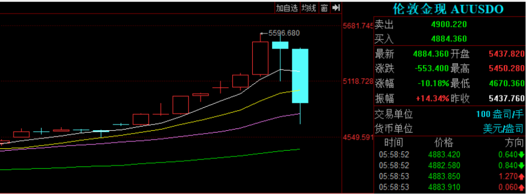 其他贵金属价格也未能幸免,白银收跌26.77%,报84.7美元/盎司,亦创下1980年年初以来的最大单日跌幅。此外,现货铂金重挫约18%,现货钯金重挫约15%。
