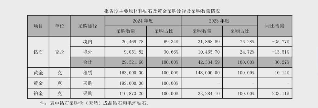 易简财经发现,迪阿股份这几年一直在调产品结构,向黄金饰品倾斜。2024年,公司钻石采购量比2022年减了一半。