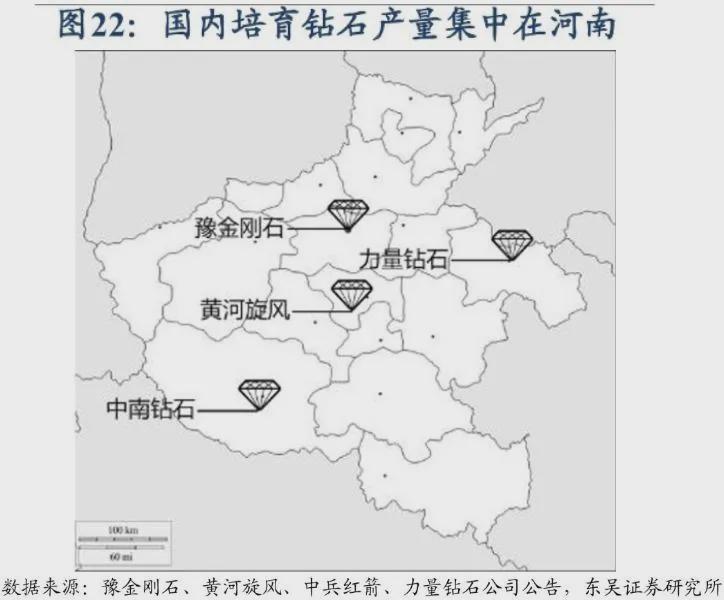 2023年中国生产的钻石毛胚超过2200万克拉,全球占比超七成,而80%的产能在河南。并且还涌现出了一批知名人造钻石企业,例如中兵红箭、黄河旋风、力量钻石、豫金刚石等等。