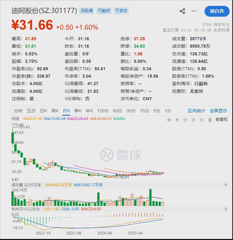 上市那年,迪阿股份营收约46亿元,净利约13亿元,是历史最高。到2024年,营收只剩约15亿元,净利降到5303万元。
