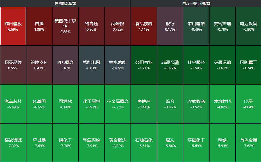 分行业来看,食品饮料、银行两大行业上涨,有色金属、钢铁、基础化工、煤炭、石油石化等行业领跌。