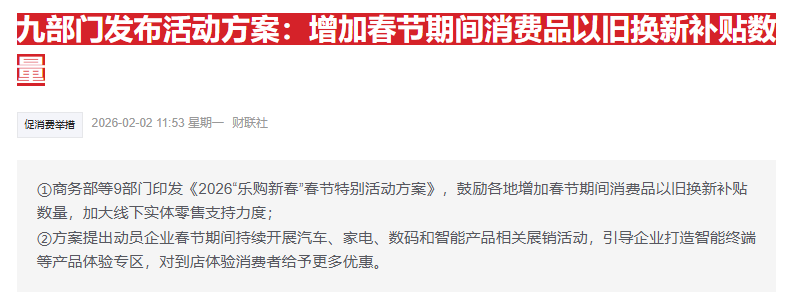 商务部等9部门印发《2026“乐购新春”春节特别活动方案》,鼓励各地增加春节期间消费品以旧换新补贴数量,加大线下实体零售支持力度。